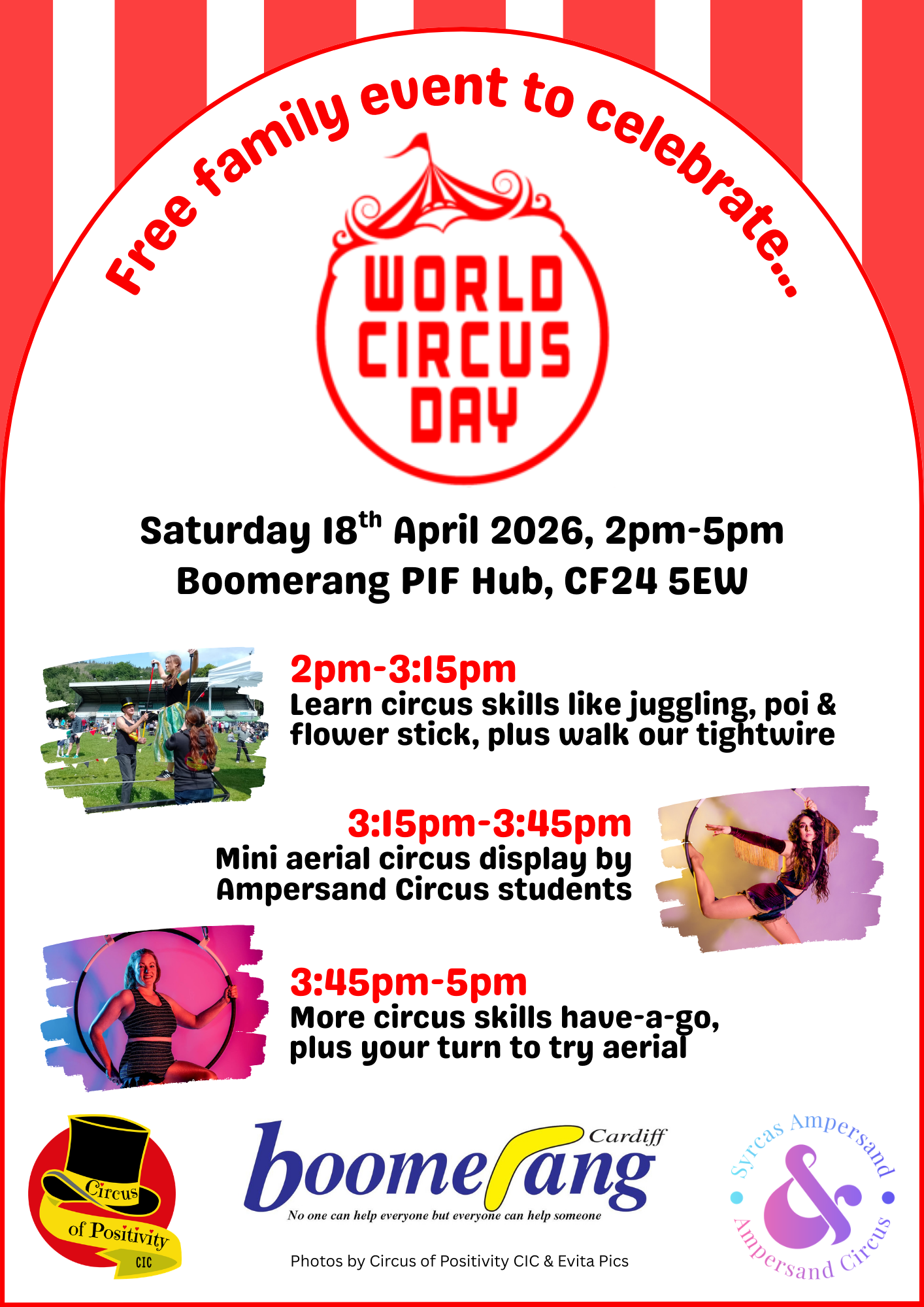 Taking place at Boomerang PIF HUB at Templar Parc in Cardiff, come along to try ground-based circus skills, tightwire walking, aerial hoop and static trapeze. There will also be mini aerial displays by Ampersand Circus students, the Boomerang tuck shop serving drinks and tasty snacks, and other activities to keep everyone entertained.